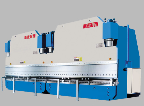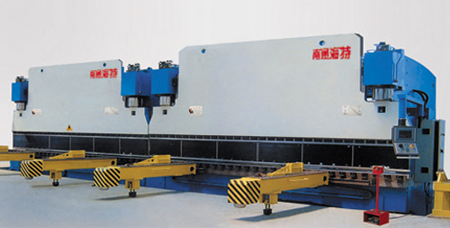 産品特點: 選用兩台WC67Y系列同規格主機,配置雙機聯動同步系統; 兩台機床同時使用可加工特長工件,也可同時單獨使用,從而提高生産效率; 上模配有撓度補償機構,确保加工工件的精度; 機械擋塊、扭軸、同步閥控制同步; 後擋料距離、上滑塊行程電動調節,數字顯示。